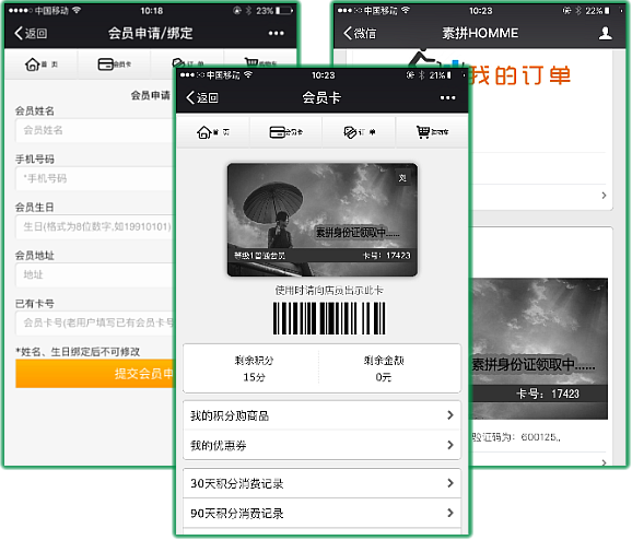 會員對接包括以下功能:會員卡申請(通過手機號對接線下會員資料),線下消費出示電子會員卡(微信驗證碼),會員積分與消費查詢等功能。